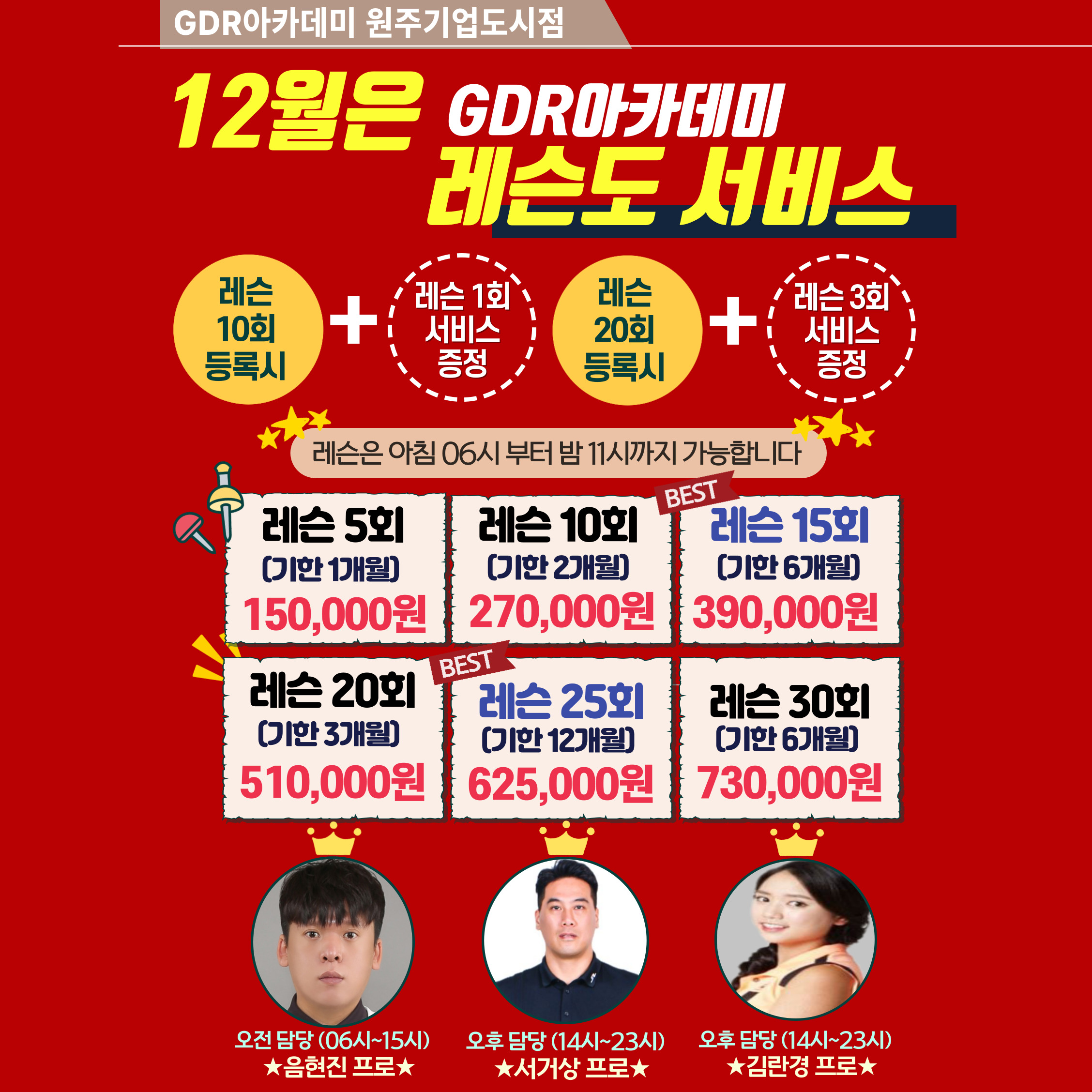 레슨 10회 등록 시 서비스 1회 / 레슨 20회 등록 시 서비스 3회 증정